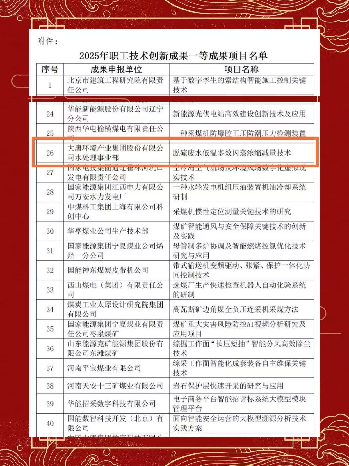 榮譽接踵而至。該技術(shù)成功入選集團科技創(chuàng)新成果推廣手冊,榮獲多項省部級與行業(yè)級科技大獎。更為重要的是,它以卓越的性能和效益贏得了市場的廣泛認可。從延安電廠出發(fā),這項技術(shù)已在大唐系統(tǒng)內(nèi)外的多家電廠的數(shù)十臺機組上成功應(yīng)用,累計為大唐環(huán)境帶來超億元的合同額。它不僅為應(yīng)用電廠帶來了顯著的經(jīng)濟效益和環(huán)保效益,更牽頭立項了相關(guān)團體標準,為高鹽廢水零排放領(lǐng)域樹立了嶄新的“大唐標桿”。2025年,其核心子技術(shù)榮獲“中國職工技術(shù)創(chuàng)新一等成果”,成為集團公司內(nèi)屈指可數(shù)的頂級職工創(chuàng)新榮譽。