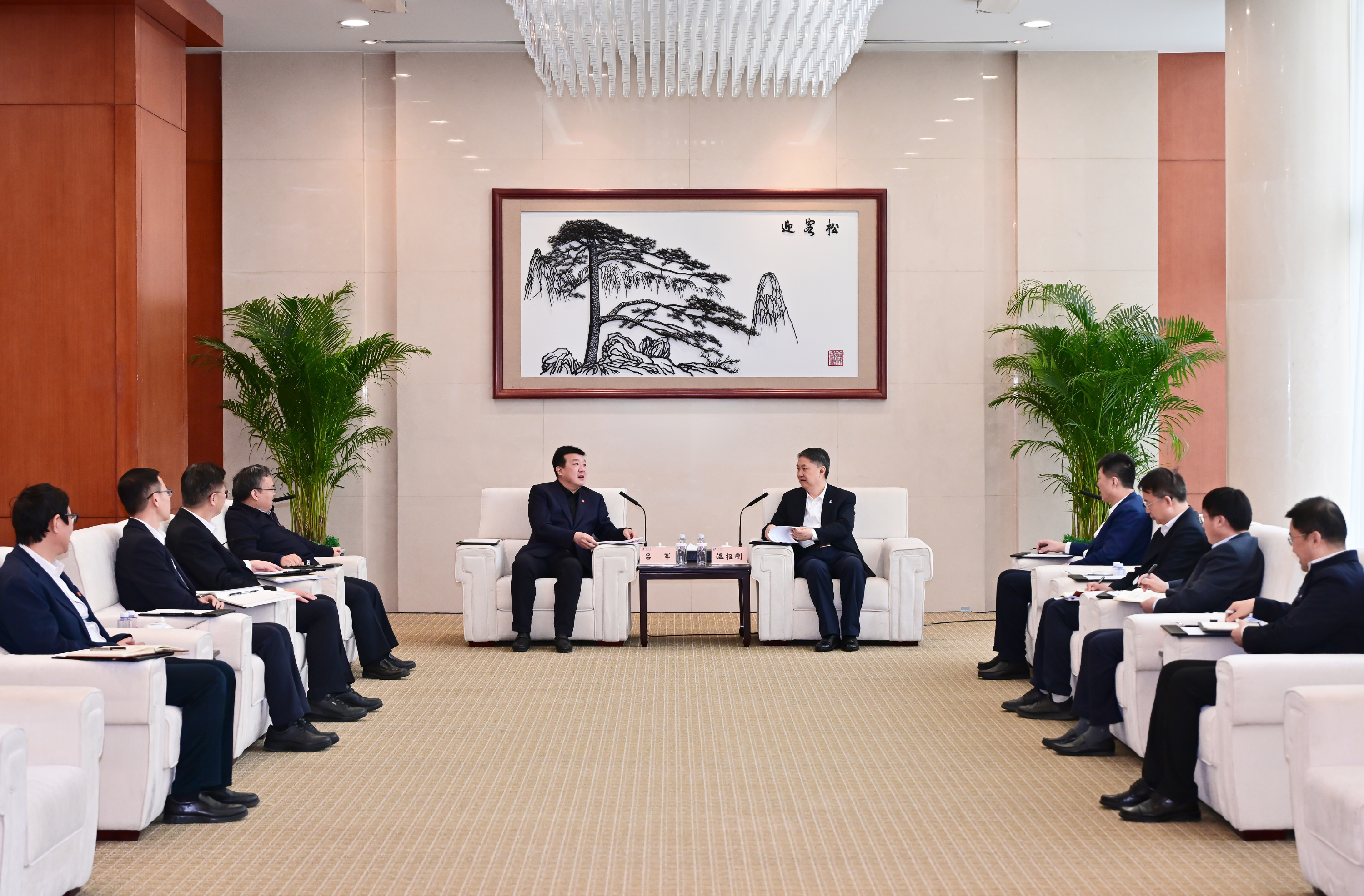 本網(wǎng)訊 3月13日,中國大唐集團(tuán)有限公司黨組書記、董事長呂軍率隊(duì)訪問中國華能集團(tuán)有限公司,與中國華能董事長、黨組書記溫樞剛會談。